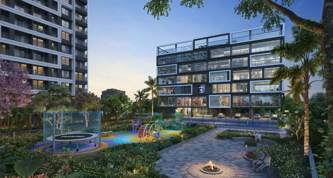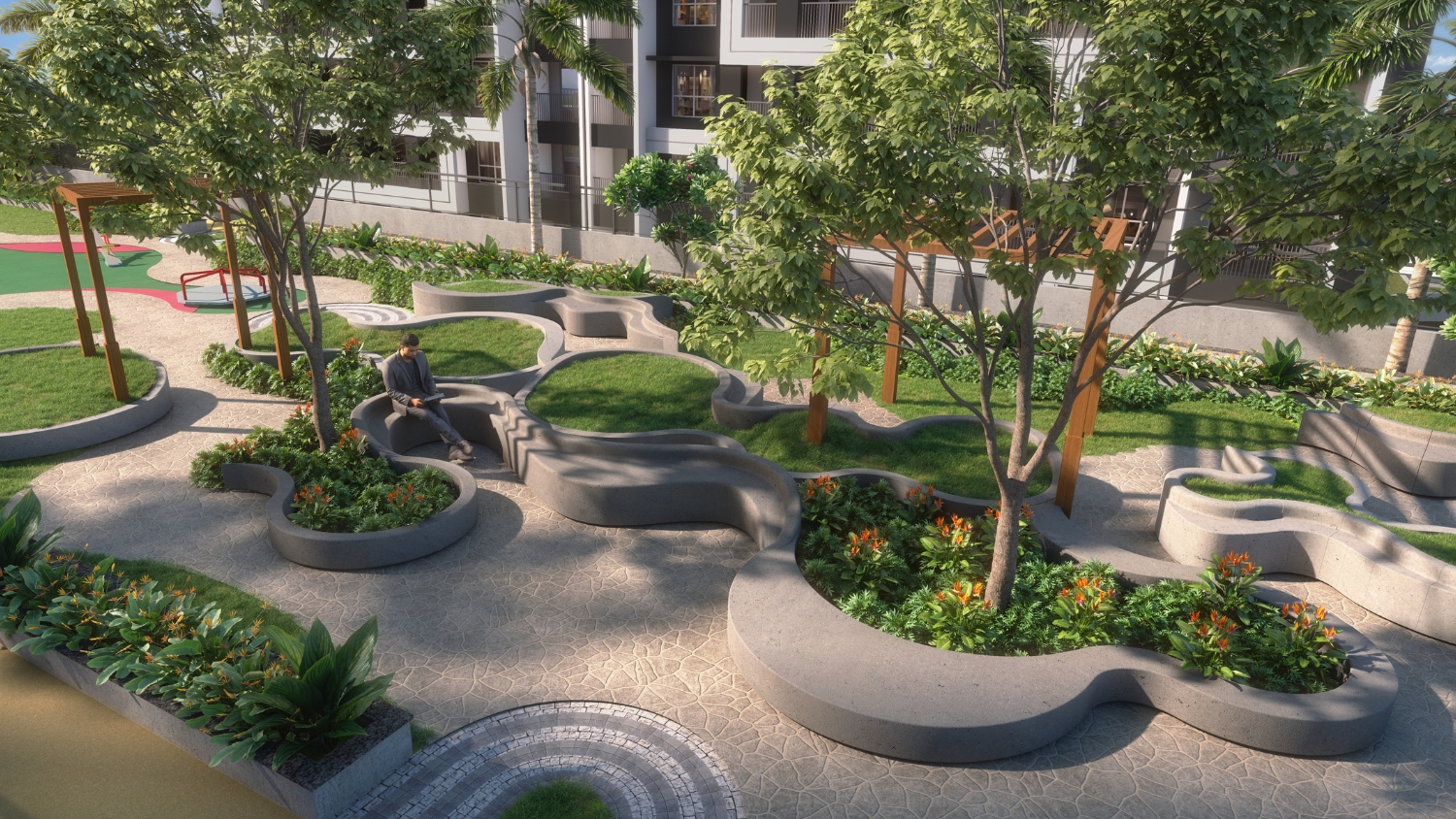 Lush garden pathways, shaded seating pockets, children’s play areas, open gym zones, and quiet corners for relaxation intersect in this serene space — a green oasis in the sky.